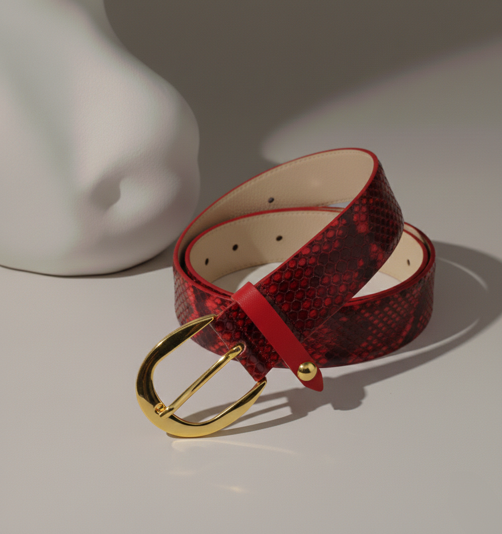 Akid belt has been expertly handmade in Italy, crafted from python in red/black hues with a gold buckle and hardware.