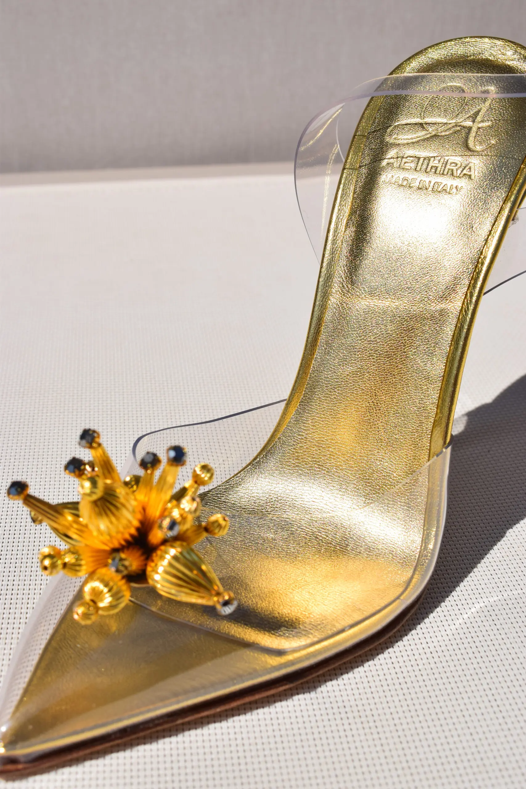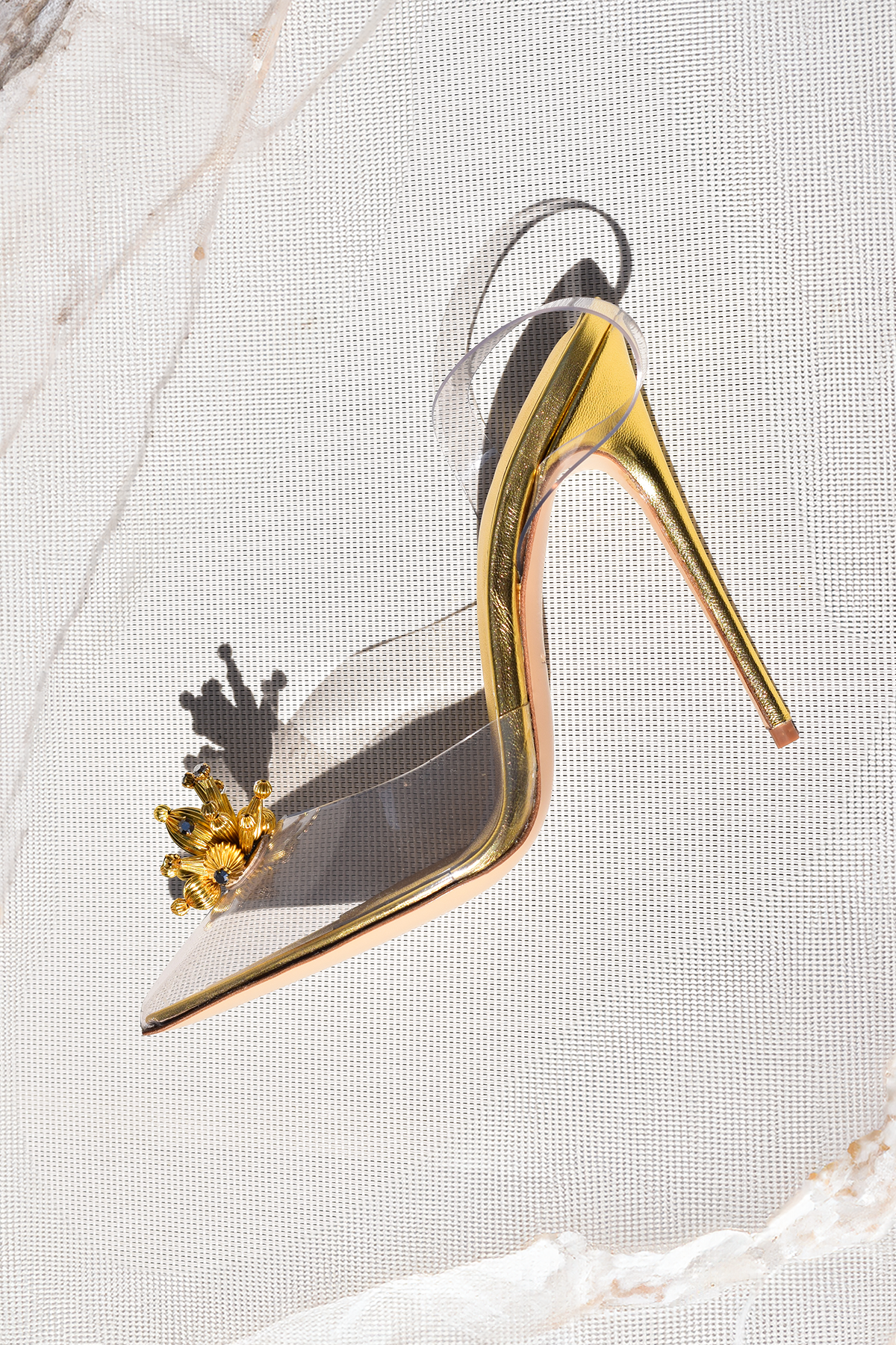 Slingback in PVC with gold accessory and 120mm stiletto heel